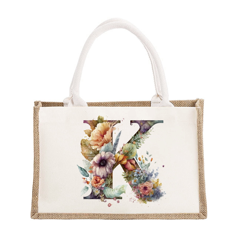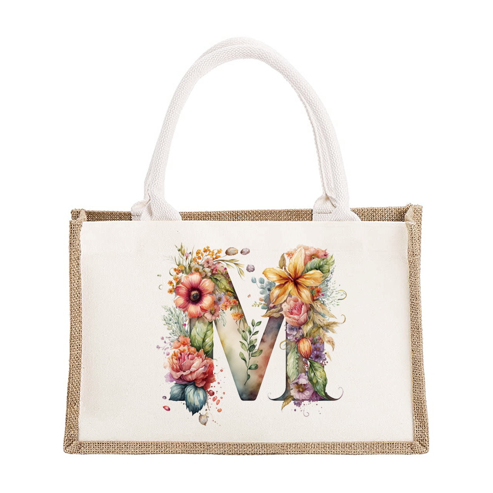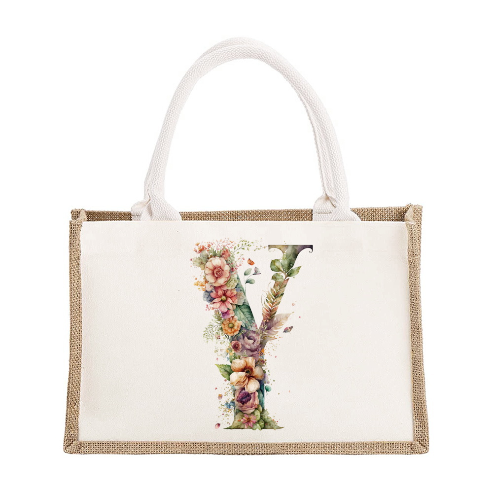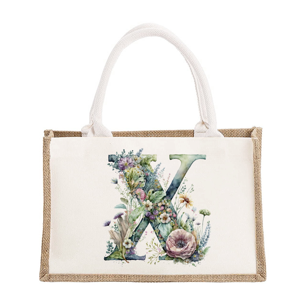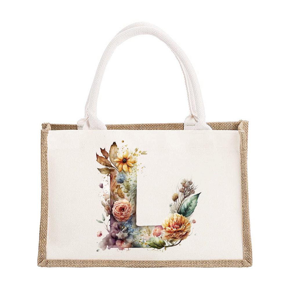 Sac à bandoulière en lin de grande capacité, sac de Shopping pour femmes, motif imprimé de lettres florales, sac d'imitation de Jute