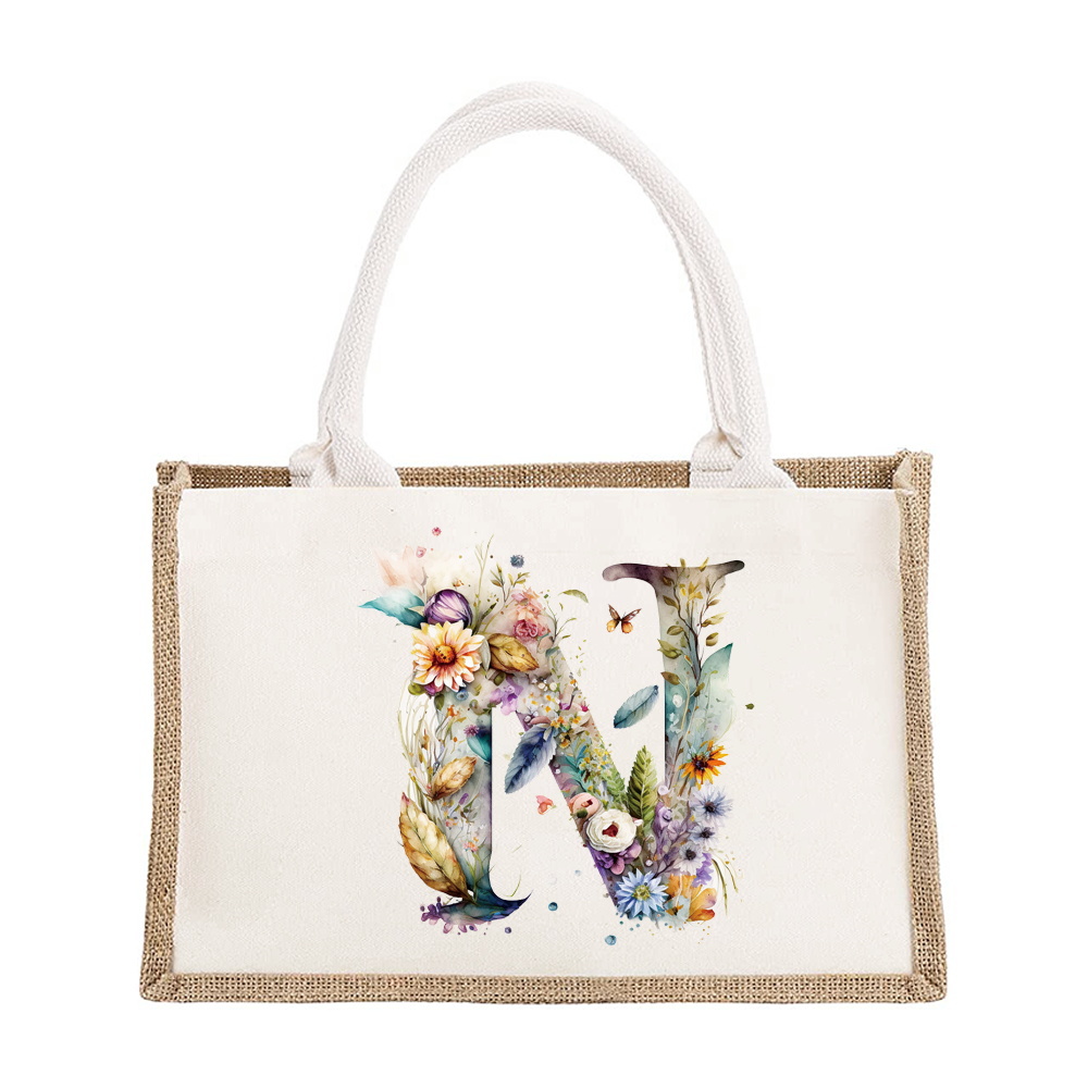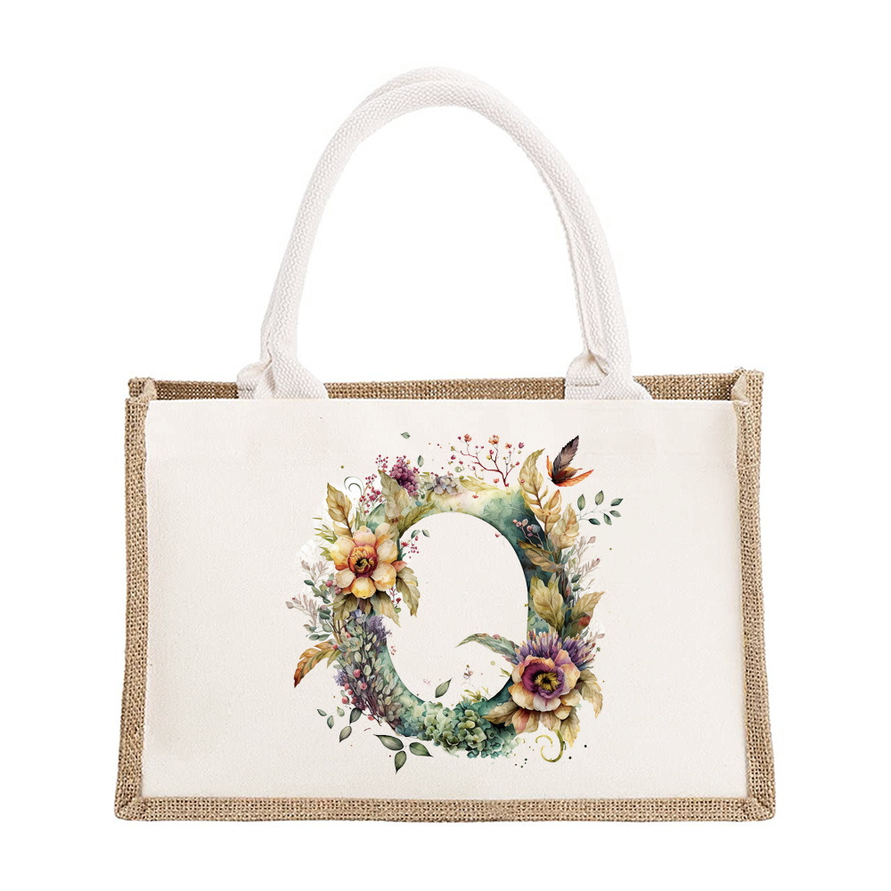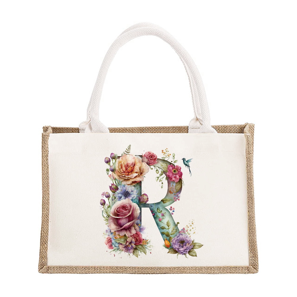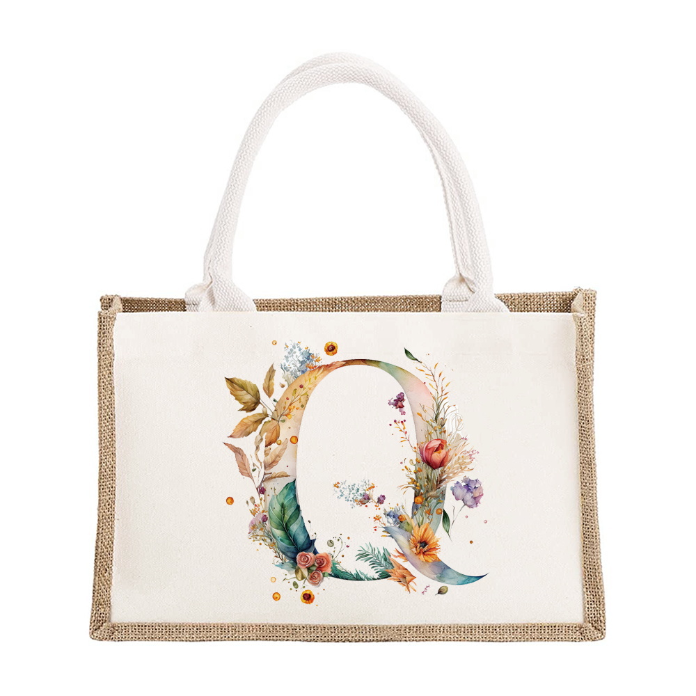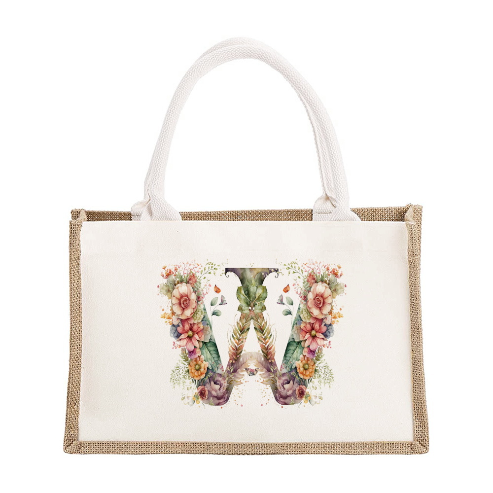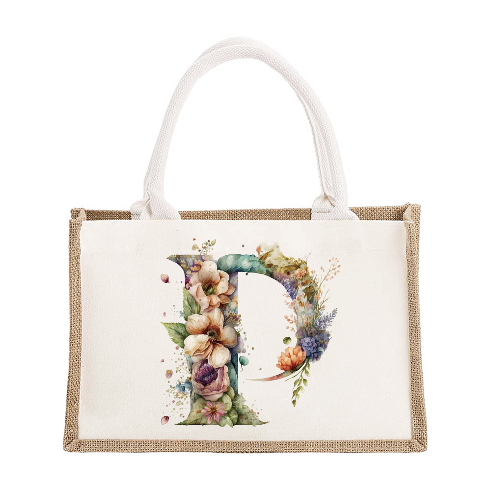 Sac à bandoulière en lin de grande capacité, sac de Shopping pour femmes, motif imprimé de lettres florales, sac d'imitation de Jute